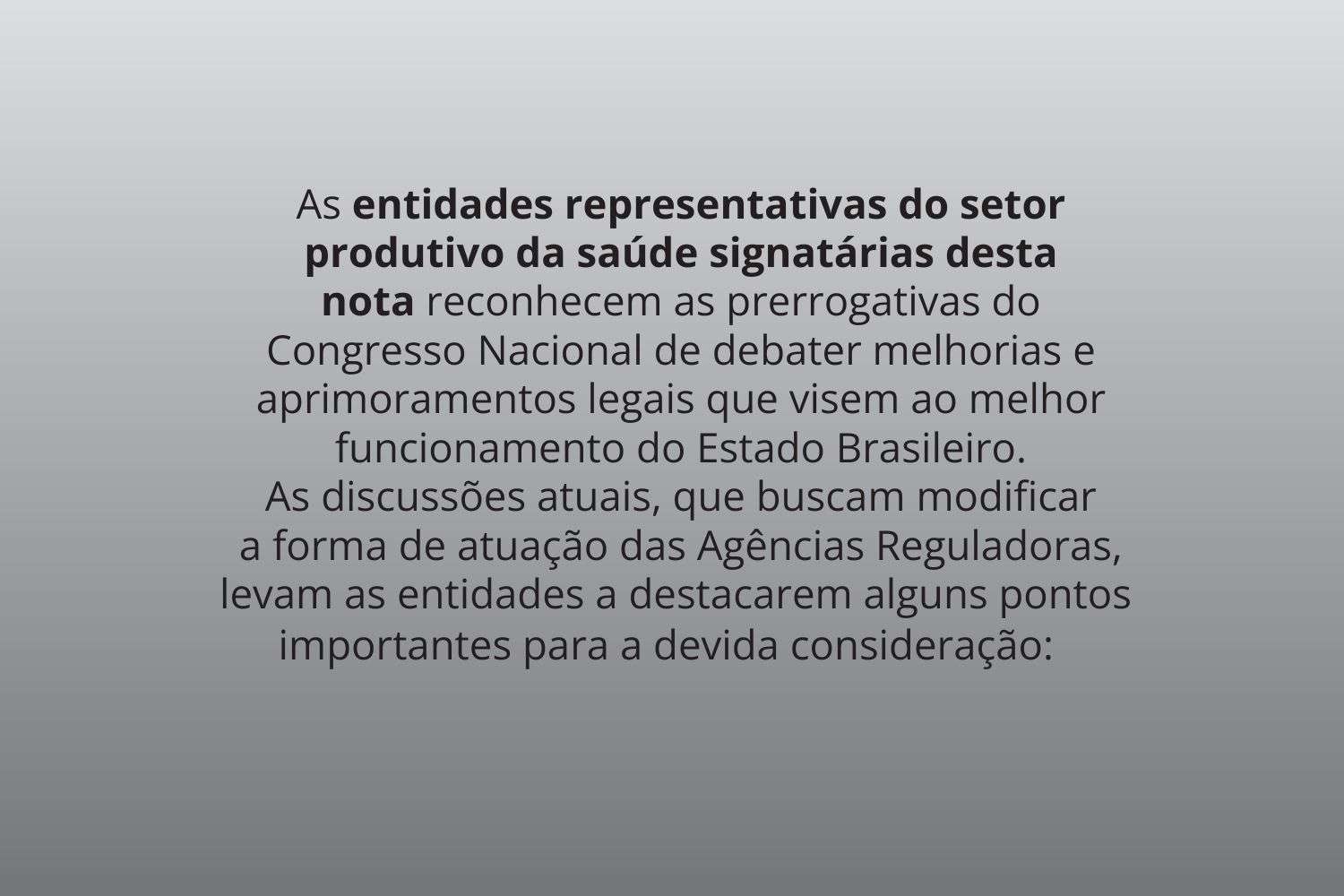 As entidades representativas do setor produtivo da saúde signatárias desta nota reconhecem as prerrogativas do Congresso Nacional de debater melhorias e aprimoramentos legais que visem ao melhor funcionamento do Estado Brasileiro. As discussões atuais, que buscam modificar a forma de atuação das Agências Reguladoras, levam as entidades a destacarem alguns pontos importantes para a devida consideração: