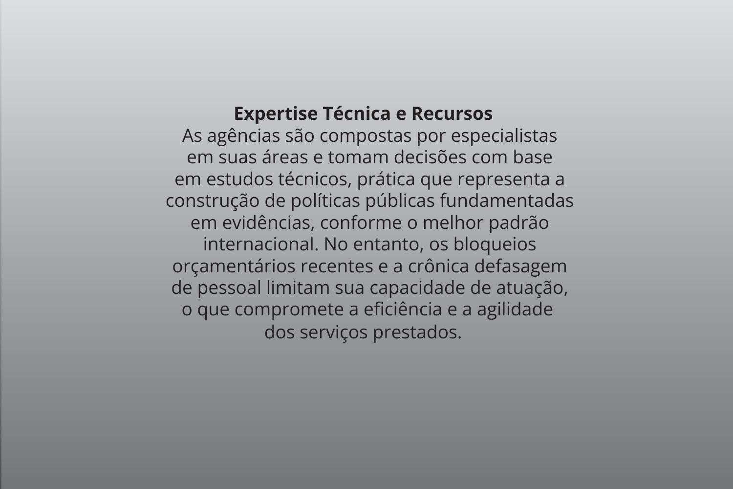 Expertise Técnica e Recursos: As agências são compostas por especialistas em suas áreas e tomam decisões com base em estudos técnicos, prática que representa a construção de políticas públicas fundamentadas em evidências, conforme o melhor padrão internacional. No entanto, os bloqueios orçamentários recentes e a crônica defasagem de pessoal limitam sua capacidade de atuação, o que compromete a eficiência e a agilidade dos serviços prestados.
