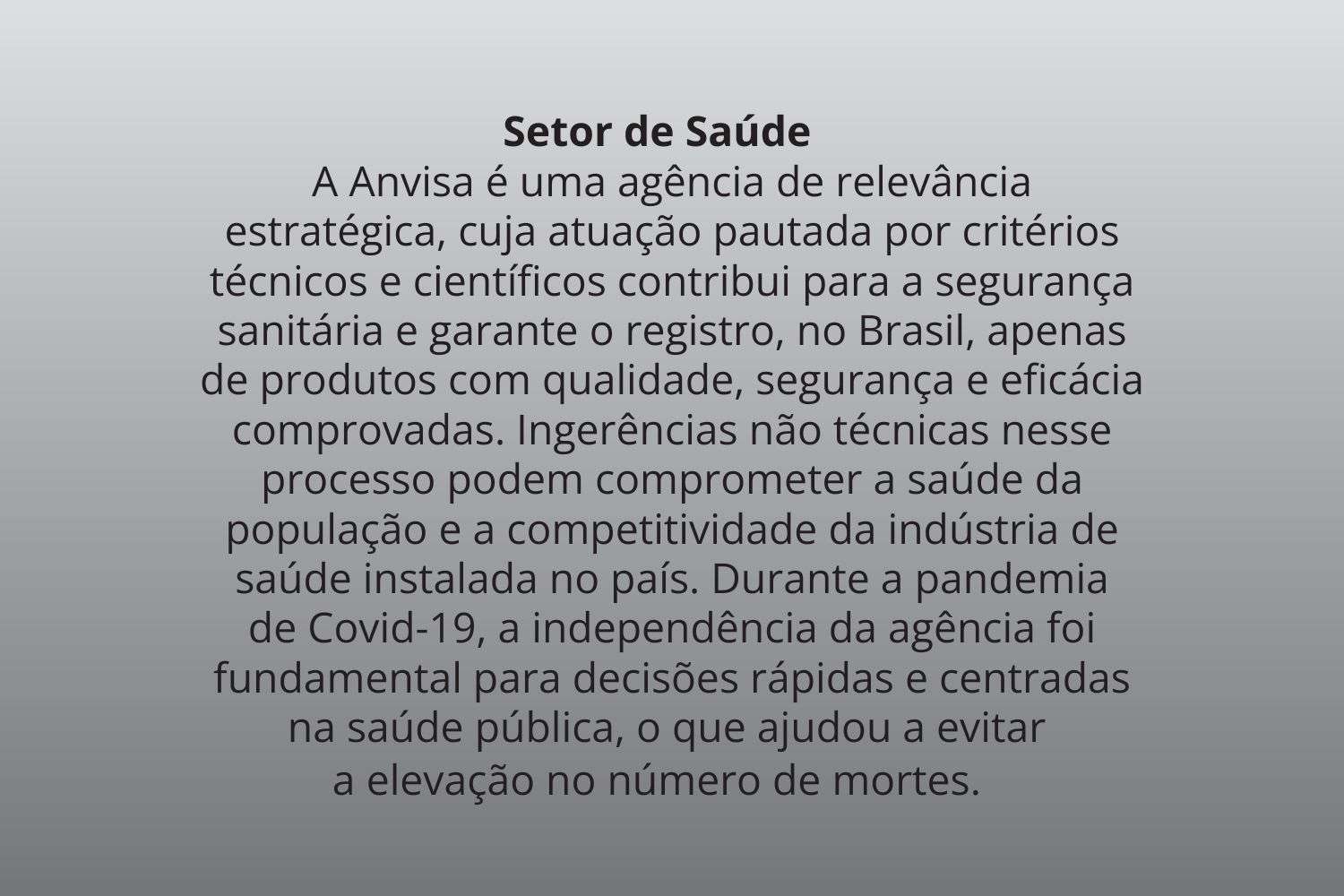 Setor de Saúde: A Anvisa é uma agência de relevância estratégica, cuja atuação pautada por critérios técnicos e científicos contribui para a segurança sanitária e garante o registro, no Brasil, apenas de produtos com qualidade, segurança e eficácia comprovadas. Ingerências não técnicas nesse processo podem comprometer a saúde da população e a competitividade da indústria de saúde instalada no país. Durante a pandemia de Covid-19, a independência da agência foi fundamental para decisões rápidas e centradas na saúde pública, o que ajudou a evitar a elevação no número de mortes.
