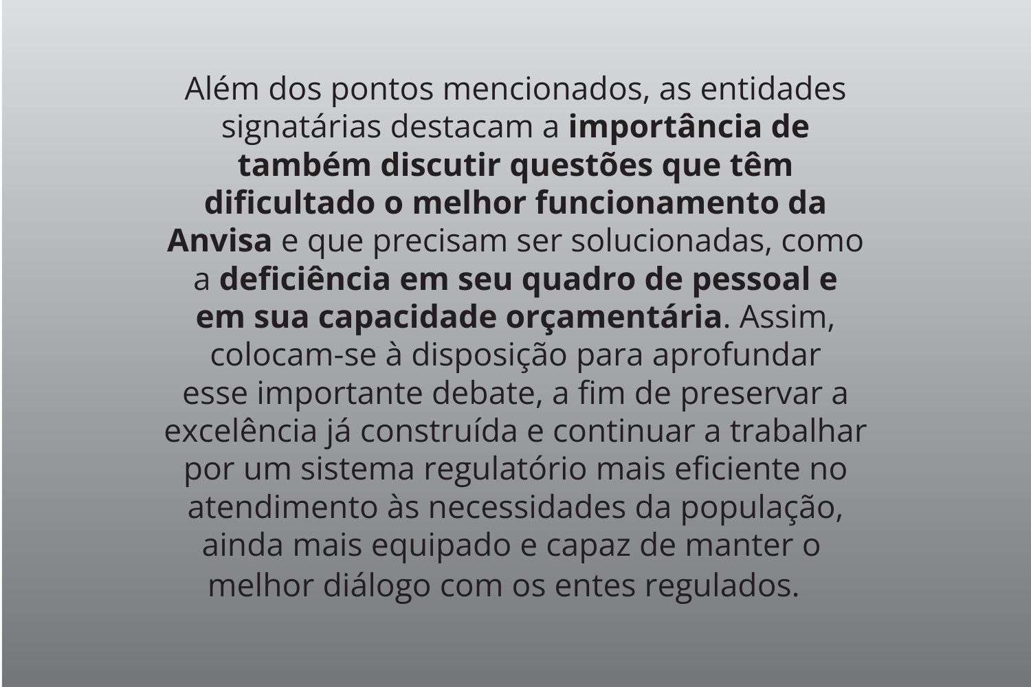 Além dos pontos mencionados, as entidades signatárias destacam a importância de também discutir questões que têm dificultado o melhor funcionamento da Anvisa e que precisam ser solucionadas, como a deficiência em seu quadro de pessoal e em sua capacidade orçamentária. Assim, colocam-se à disposição para aprofundar esse importante debate, a fim de preservar a excelência já construída e continuar a trabalhar por um sistema regulatório mais eficiente no atendimento às necessidades da população, ainda mais equipado e capaz de manter o melhor diálogo com os entes regulados.”