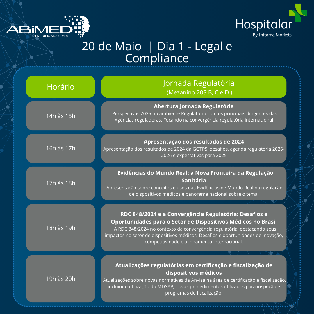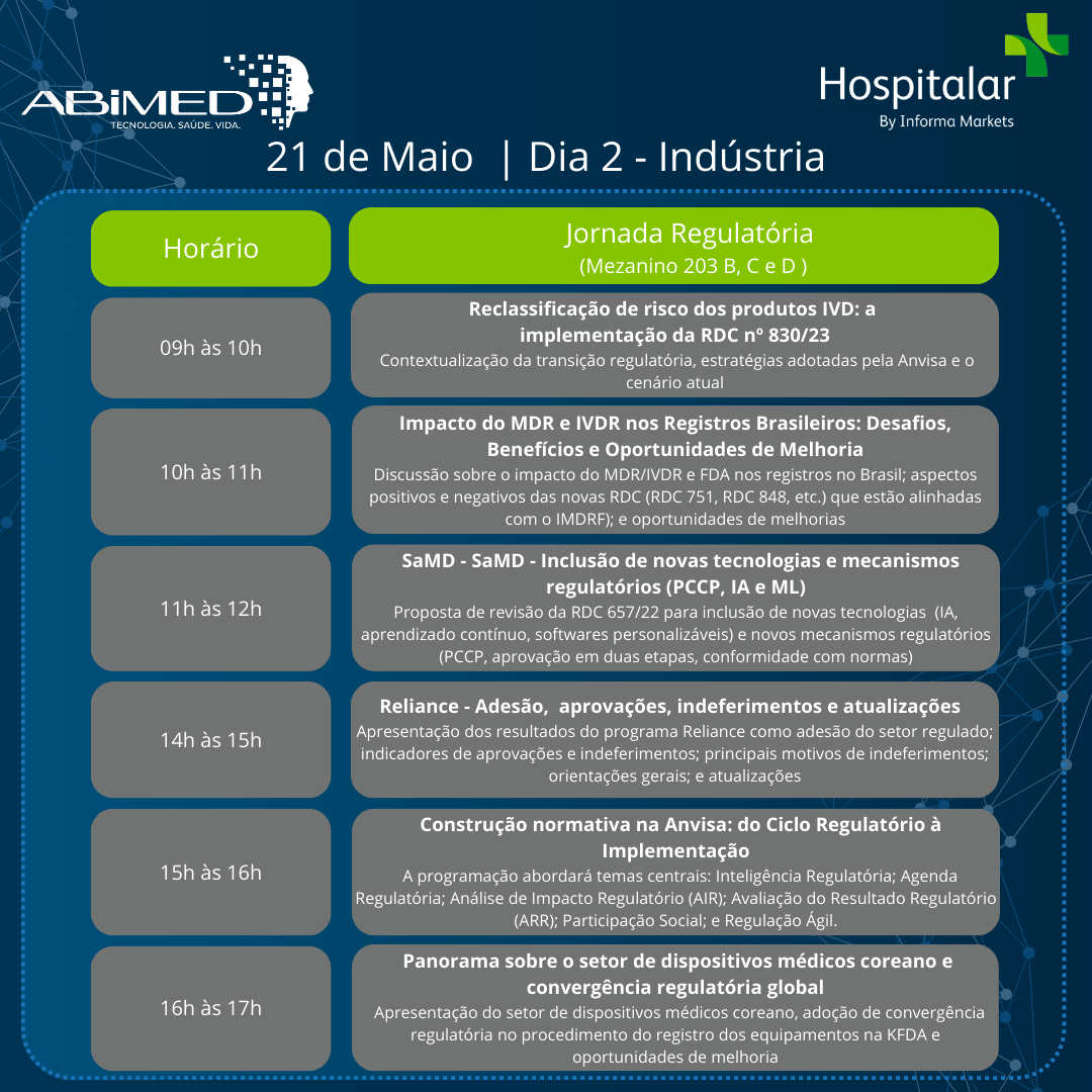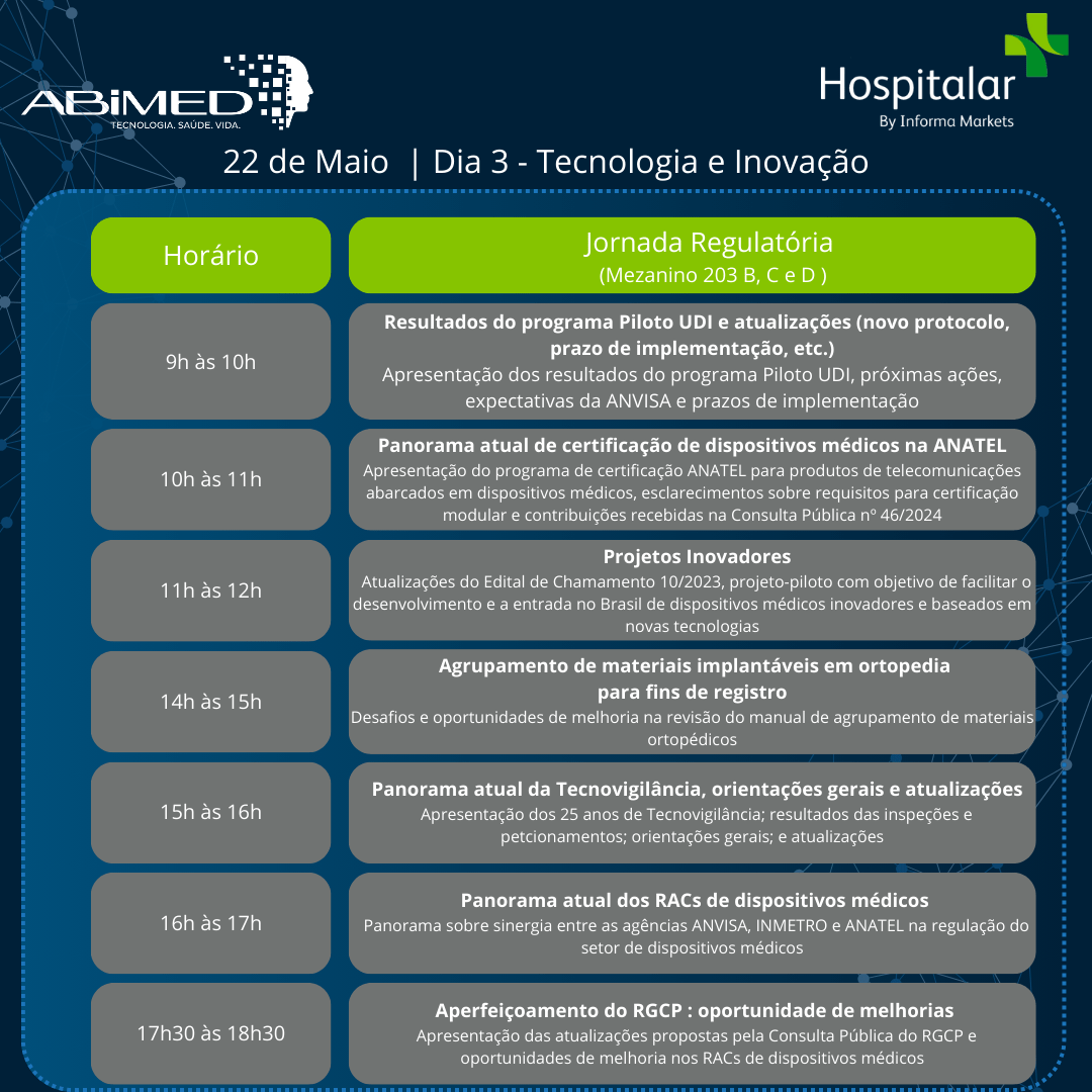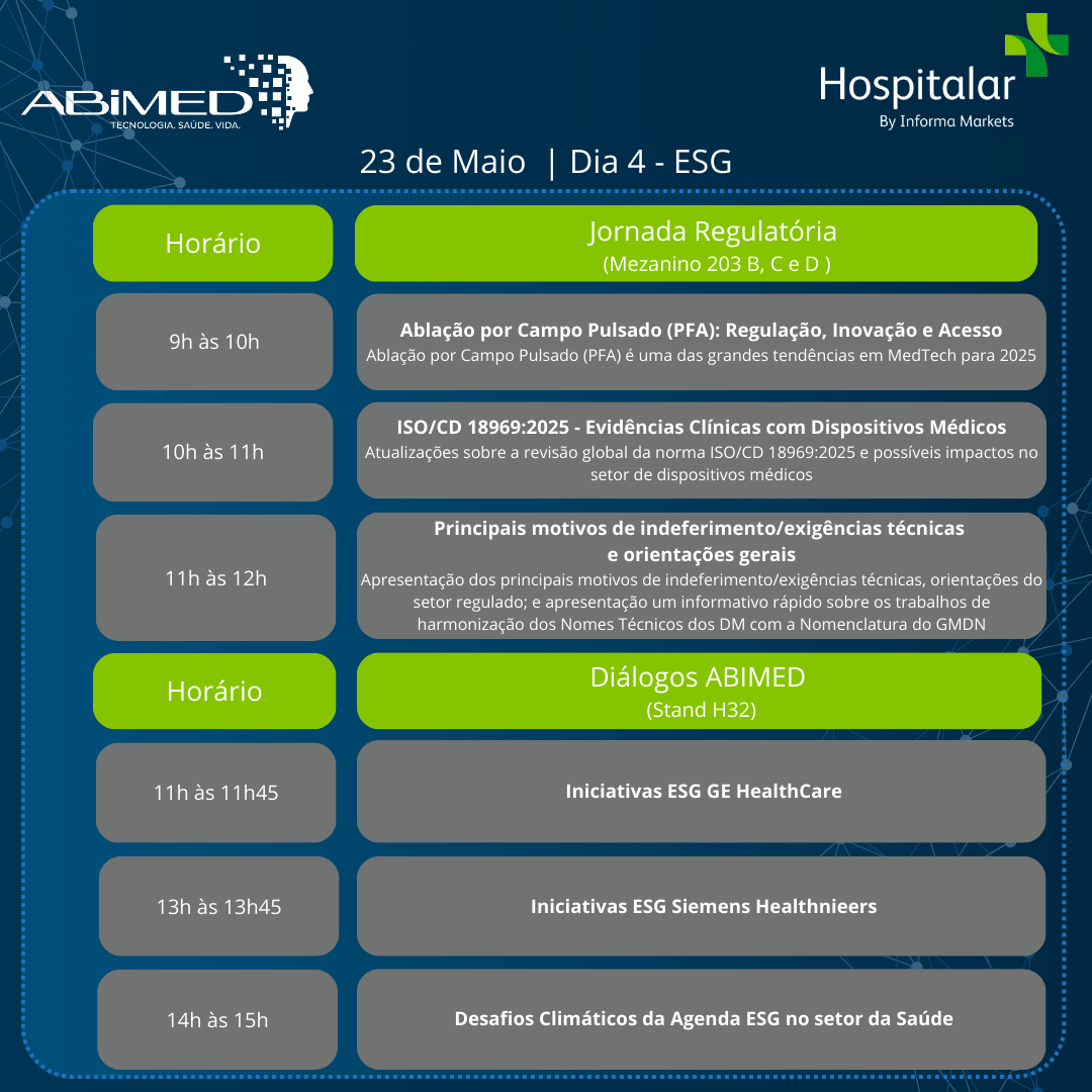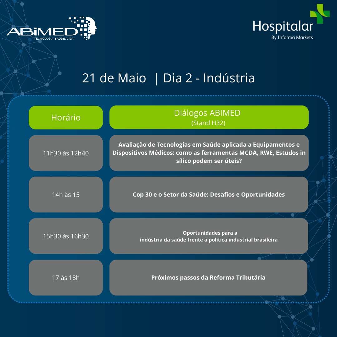 A ABIMED é patrocinadora institucional da Hospitalar e em 2025 e promoverá uma programação especial, em dois ambientes, durante os quatro dias de evento. Nossas atividades estarão divididas entre a Jornada Regulatória ABIMED, no Mezanino 203 B, C e D, e os Diálogos ABIMED, no nosso estande H32. Ao todo serão quatro dias de programação intensa e totalmente gratuita da ABIMED para os visitantes da Hospitalar 2025.