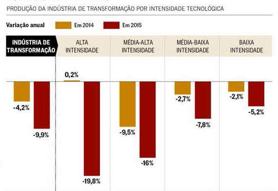 Mais do que a retração de 8,3% na produção, o declínio da atividade industrial brasileira em 2015 trouxe um dado ainda mais preocupante: pela primeira vez desde 2002, entre os diferentes setores da indústria de transformação, a queda foi mais acentuada nos segmentos com níveis de utilização de tecnologia mais elevados. Levantamento do Instituto de Estudos para o Desenvolvimento Industrial ( Iedi) mostra que as indústrias de alta intensidade tecnológica, categoria que inclui a de produtos farmacêuticos, informática, eletroeletrônicos, equipamentos de comunicação e de aparelhos médios e de precisão, apresentaram retração de 19,8%, um patamar de queda nunca registrado nos anos 2000.