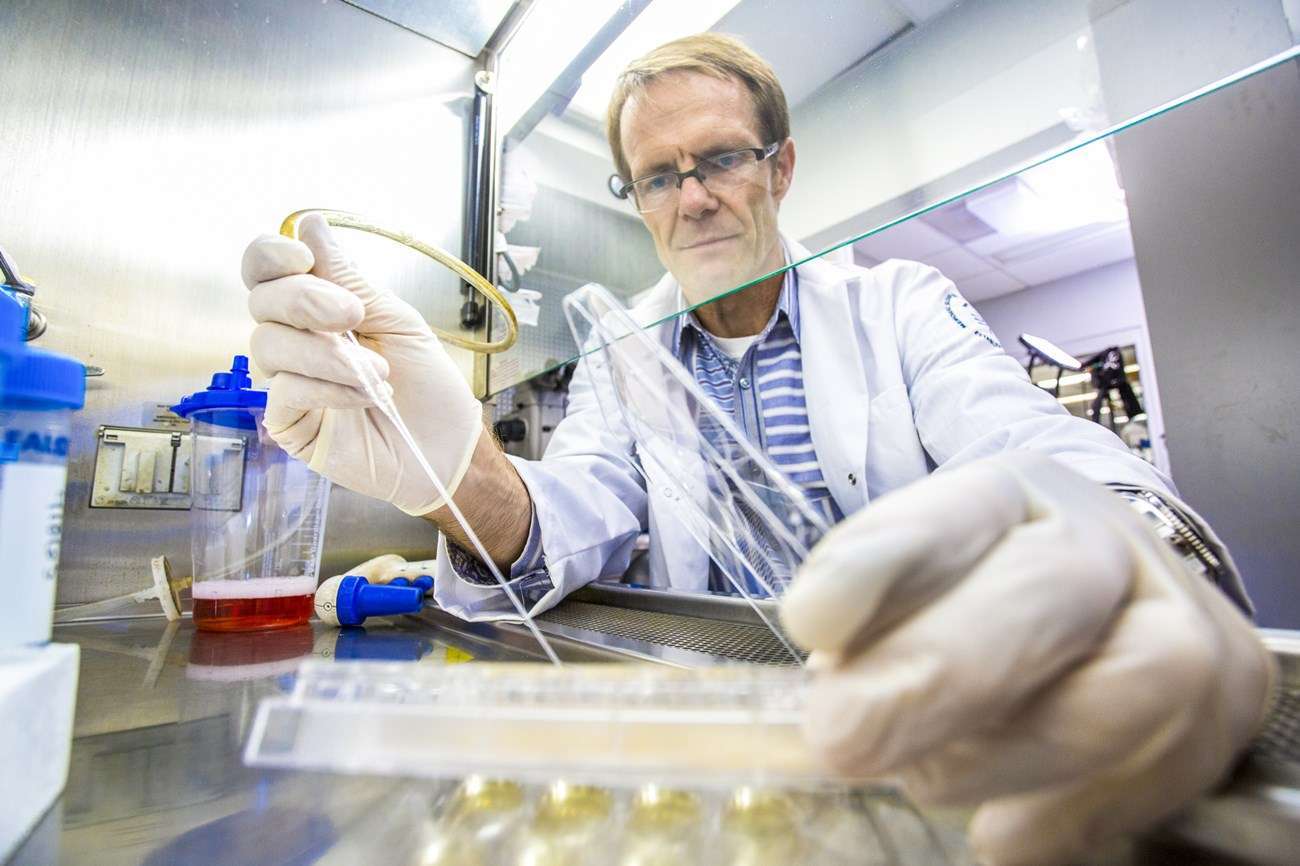 With sideswept light hair and sharp gray eyes, Studer has some levity to him; a Swiss family man, he reminisces about the good old days when he used to bring his young daughter into the lab to “feed the cells” (a practice that got the ax thanks to insurance gripes). He jokes about the “moon suit” he wears in his lab, which is filled with a smattering of grad students and post-docs blasting Top 40 hits.