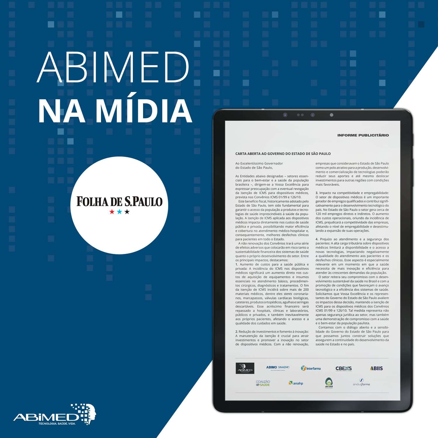 As Entidades abaixo designadas – setores essenciais para o bem-estar e a saúde da população brasileira –, dirigem-se a Vossa Excelência para expressar preocupação com a eventual revogação da isenção de ICMS para dispositivos médicos, prevista nos Convênios ICMS 01/99 e 126/10.