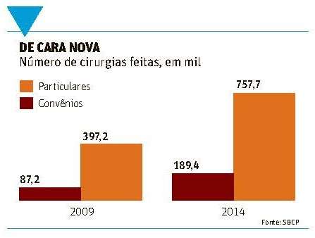 As operações plásticas no país custeadas por convênios médicos passaram de 87,2 mil, em 2009, para 189,4, em 2014 —um aumento 117%em cinco anos, segundo dados da SBCP (Sociedade Brasileira de Cirurgia Plástica).